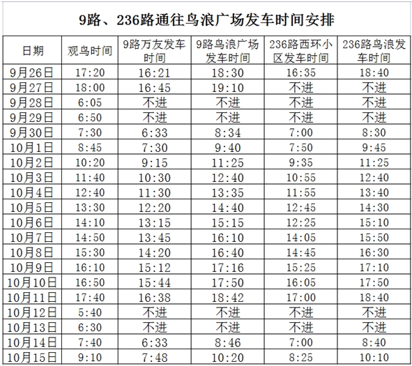 為方便市民“國慶”“中秋”節(jié)日期間觀賞自然景觀時(shí)順暢出行,營口交運(yùn)集團(tuán)適時(shí)調(diào)整部分公交線路班次。從9月26日起—10月15日,公交9路、236路分時(shí)段區(qū)間延伸至大遼河口鳥浪廣場(chǎng)運(yùn)營。